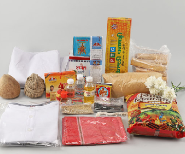 All essential items like ghee, kapda, kapoor, and wood for rituals.